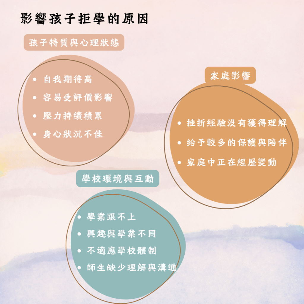 拒學並不是一種疾病診斷,而是心理、身體、社會等多重因素長期累積的結果。它並非一朝一夕形成,也很少只由單一原因造成。